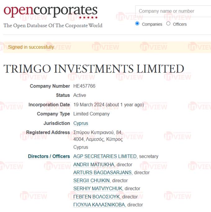 Розгалужена мережа міжнародних фірм Андрія Матюхи звичайно не могла обійтися без Кіпру. На цьому офшорному півострові в березні 2024 року він відкрив Trimgo investments limited.