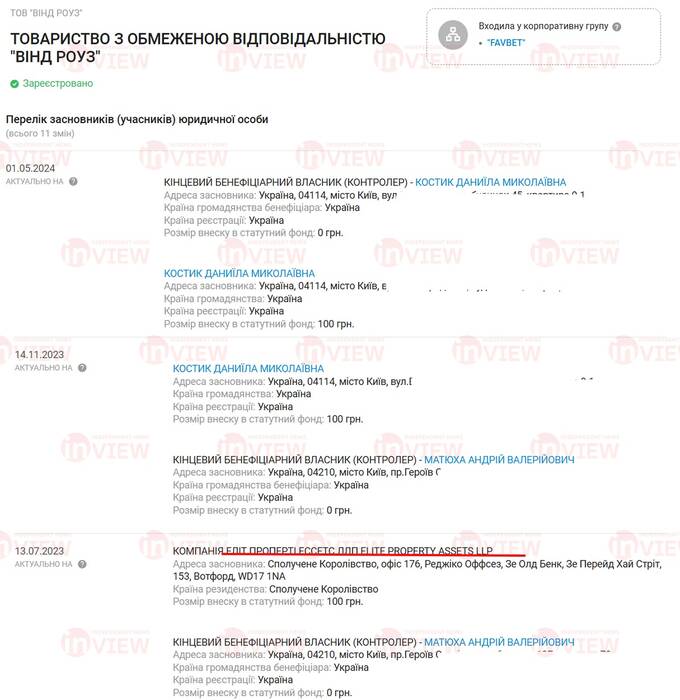 В  українських реєстрах вона згадувалась серед засновників ТОВ «Вінд Роуз». До листопада 2023 року Матюха був бенефіціаром цієї київської фірми. Зараз її переписали на Даніїлу Костик, з якою він пов’язаний через ТОВ «Гастротур». Цікаво, що жінка є керівником чи учасником майже 50 компаній, зареєстрованих в різних куточках України.